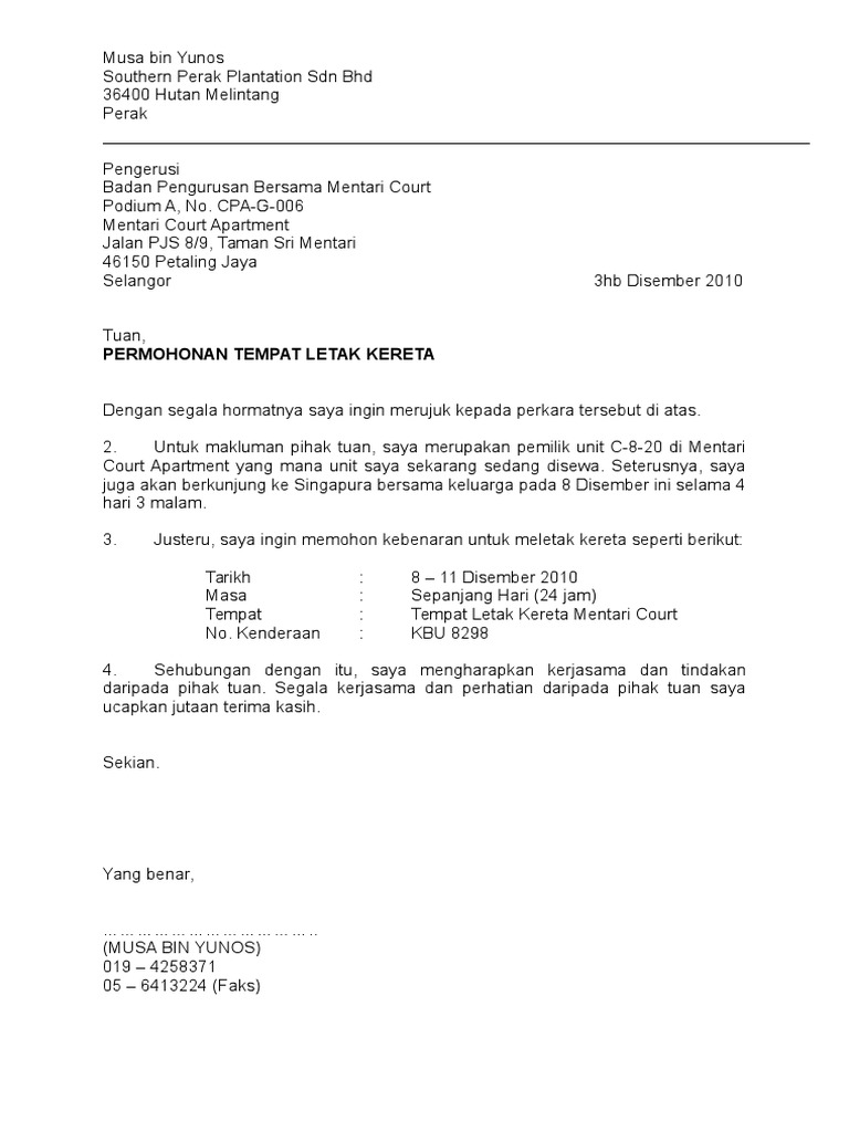 Tempat Letak Kereta Parking vi. Contoh surat rasmi permohonan tukar. Saya dengan ini mengesahkan telah.